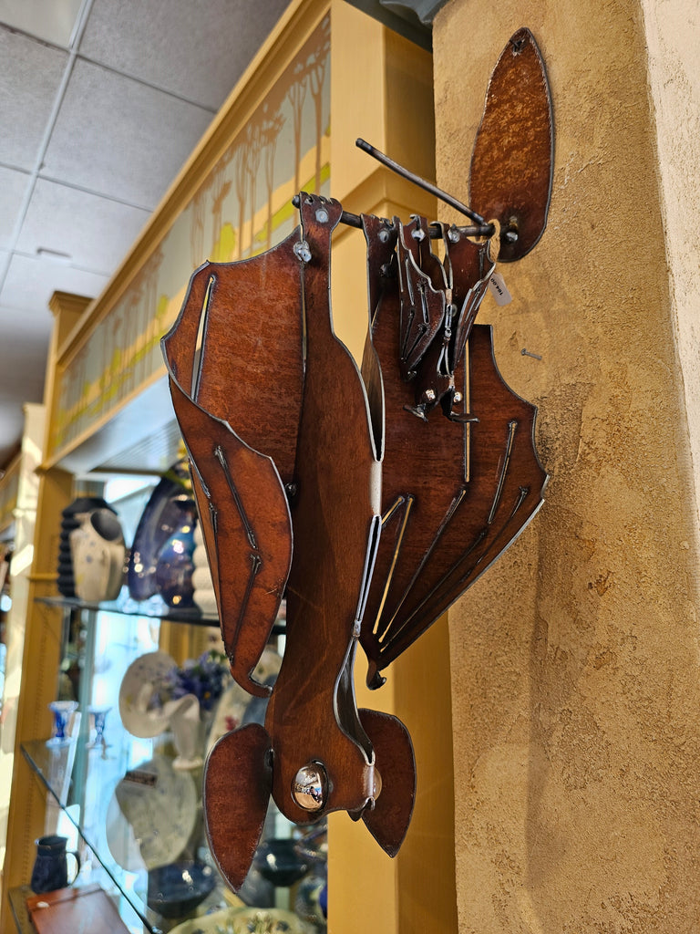 Bring a touch of whimsical charm to your home or garden with this enchanting sculpture of a mama and baby bat. Handcrafted with meticulous attention to detail, this piece features a loving mother bat cradling her baby in her wings. The sculpture is made from durable metal, with stainless steel eyes that add a lifelike sparkle. The 3-D curved body design gives it a dynamic presence, making it a captivating addition to any space.